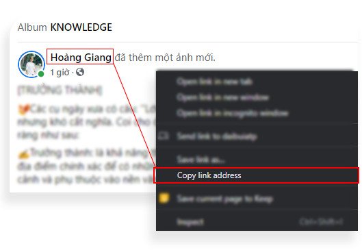 - “CLICK” chuột phải vào tên người dùng Facebook cần lấy UID chọn “Copy link adress” hoặc “Sao chép liên kết”
